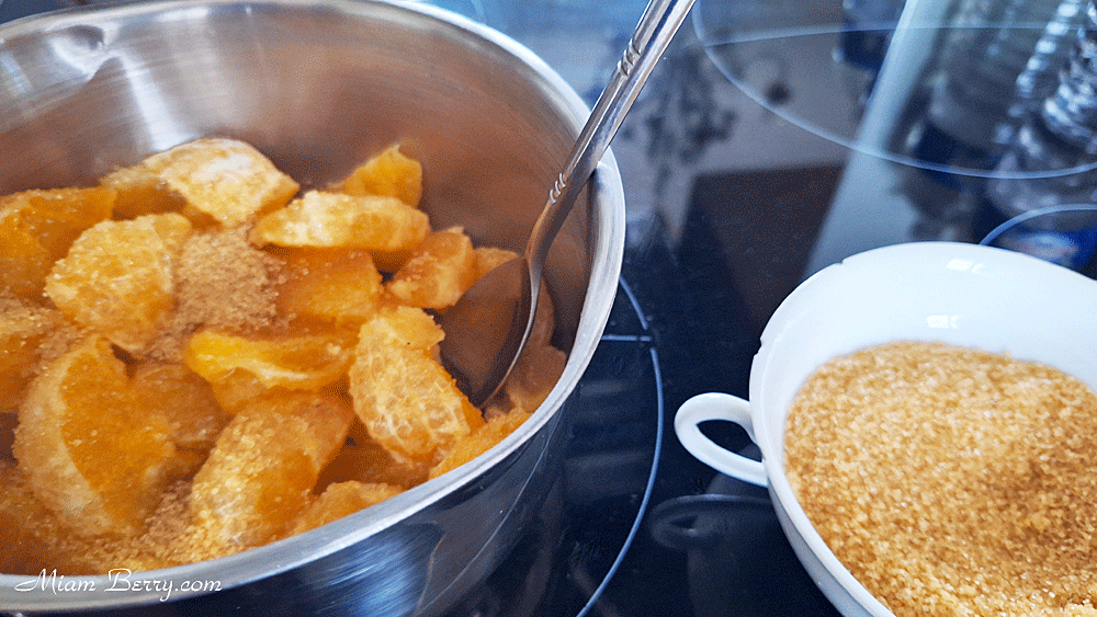 • 300g de sucre cassonade ( sucre de canne) + 1 c. à s. de sucre spéciale confiture.