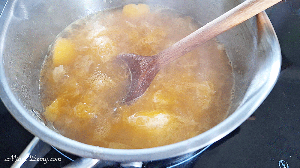 2. Dans une casserole, j’ai mis les fruits, le sucre cassonnade, le sucre gélifiant, le jus de citron et le morceaux de citron à cuire ensemble, pas tout-à-fait 35 mn par rapport à la quantité dont je disposais. Une cuisson douce, en remuant d temps en temps ce mélange avec la cuillère de bois, puis je poursuivais la cuissons à feux plus élevé, une dizaine de mn.