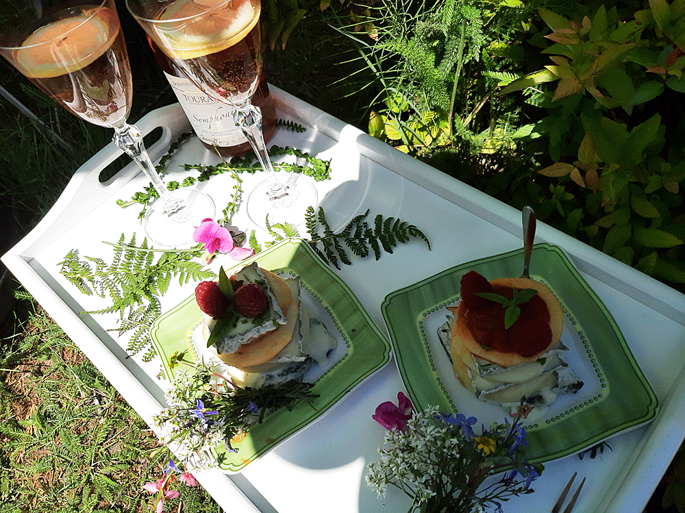La Touraine à 1 h 07 mn du Berry, nous laissions ce jour-là le vin berrichon en accordant le privilège à cette jolie voisine qu’est la Touraine. Symphonie. Le nom m’inspira poésie au cœur de son vignoble, me séduisit. Fruité et floral, que nous apprécions pour sa fraîcheur et qui allait accompagner ce déjeuner estival. Un bon vin idéal avec une entrée fruitée comme ici, ainsi qu’avec certains fromages du terroir ou avec un dessert.
