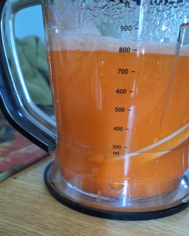 Lorsque les carottes sont cuites, les mettre avec leur jus de cuisson dans le bol mixeur.