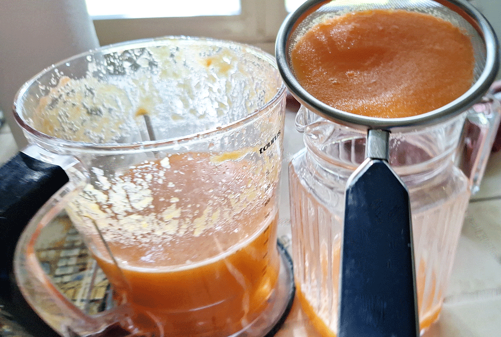 Pour avoir comparé les deux options, je trouve que cuire les carottes apporte davantage d’onctuosité. Puis, au-dessus d’un saladier, placez une passoire : coulez le jus et avec le dos d’une cuillère ou bien d’une maryse, bien appuyer sur la pulpe puis filtrer.