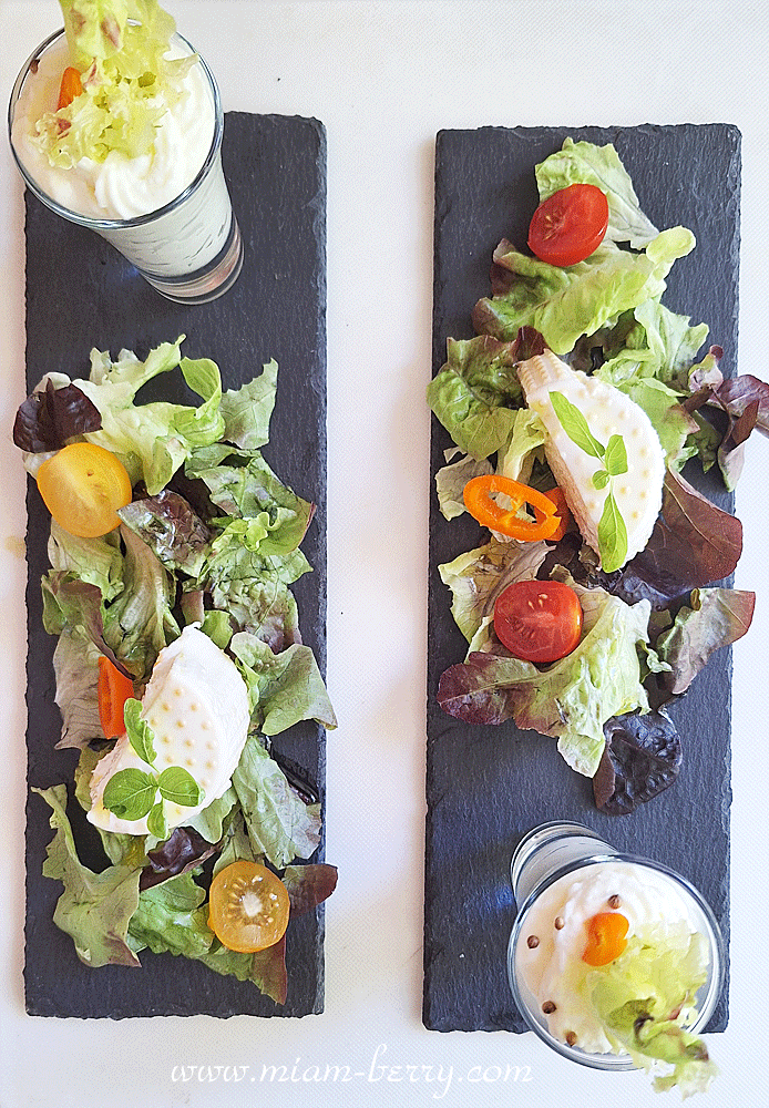 Tentez la mozzarella accompagnée d’une salade associant roquette, mesclun, tomates-cerises, chapelure et thym-citron. Le tout assaisonné d’un filet d’huile d’olive, puis salez et poivrez à votre convenance.
