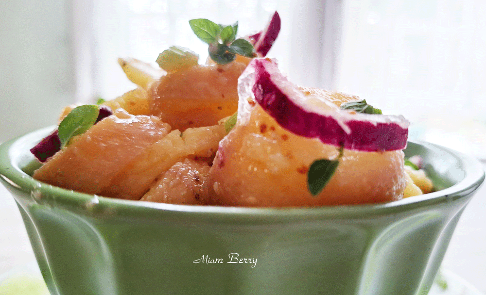 • Salade de pommes de terre à la vinaigrette : J’aime assez la préparer sans lardons, le plus naturellement qui soit, avec des pommes de terre du potager lorsque récoltées. Sinon pour 4 personnes :