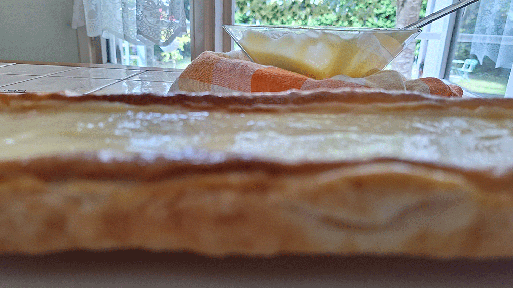 ° Comme mentionné au début de l’article, la crème a été faite la veille pour le lendemain. Lorsque sortie du réfrigérateur, elle a été énergiquement fouettée et laissée à température ambiante, avant de l’avoir versée sur le fond de tarte, puis lissée à la spatule.