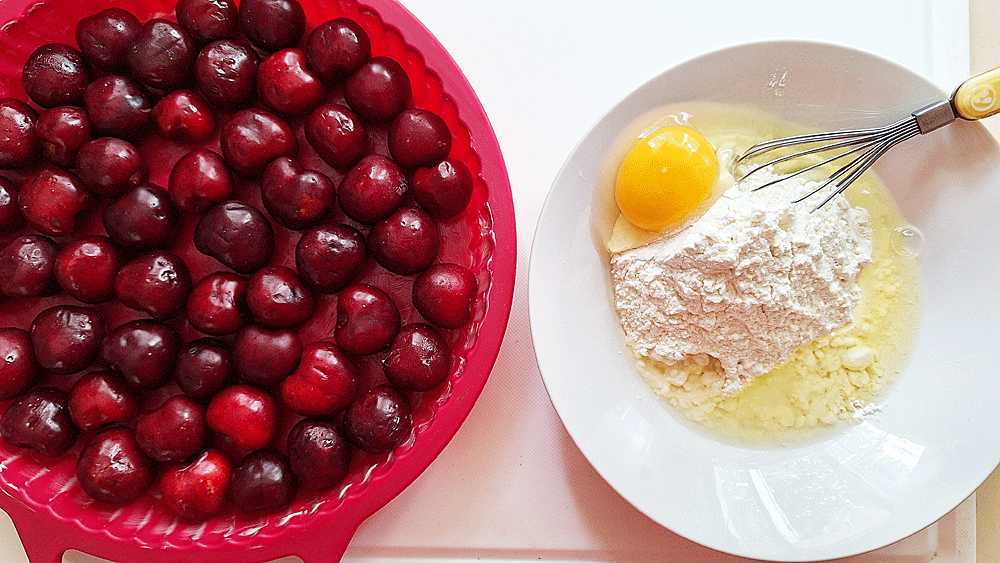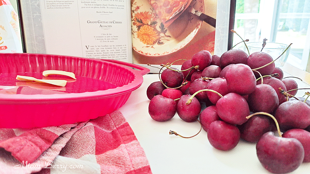 - Je commençais par préchauffer le four à 170 °C. Ensuite, à laver, équeuter les cerises sans les dénoyauter. Dans un moule à cuisson, beurré, je répartissais uniformément les cerises sur 2 rangées, comme mentionné dans la recette.