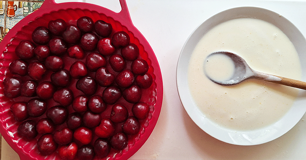 La pâte est prête à être versée sur les cerises et remplir tous les interstices. À ce propos, il est aussi préconisé de ne pas avoir la main lourde, ce qui alourdirait d’ailleurs la pâte elle-même et ce n’est pas le but recherché.