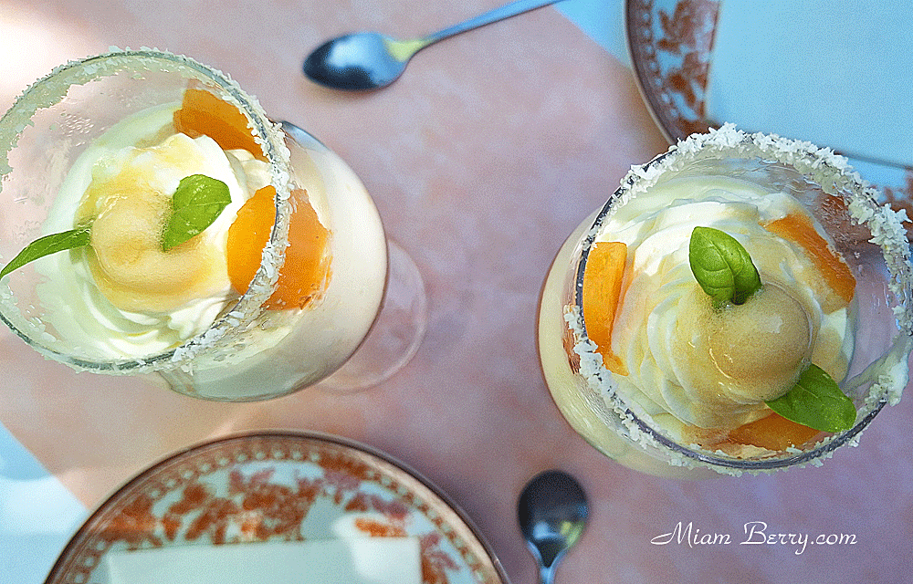 / Avec une cuillère parisienne, je chapeautais l’ensemble d’une mesure de sorbet melon, terminant par 2 petites feuilles de basilic autour, pour chaque portion.