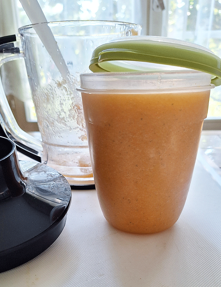 Des autres moitiés, prélever toute la chair des melons. La couper en petits dés, puis la mettre dans le mixer ou blender, avec les feuilles de basilic (facultatif). L’arôme du basilic révèle délicieusement celle du melon, la petite fraîcheur tonifiante en plus.