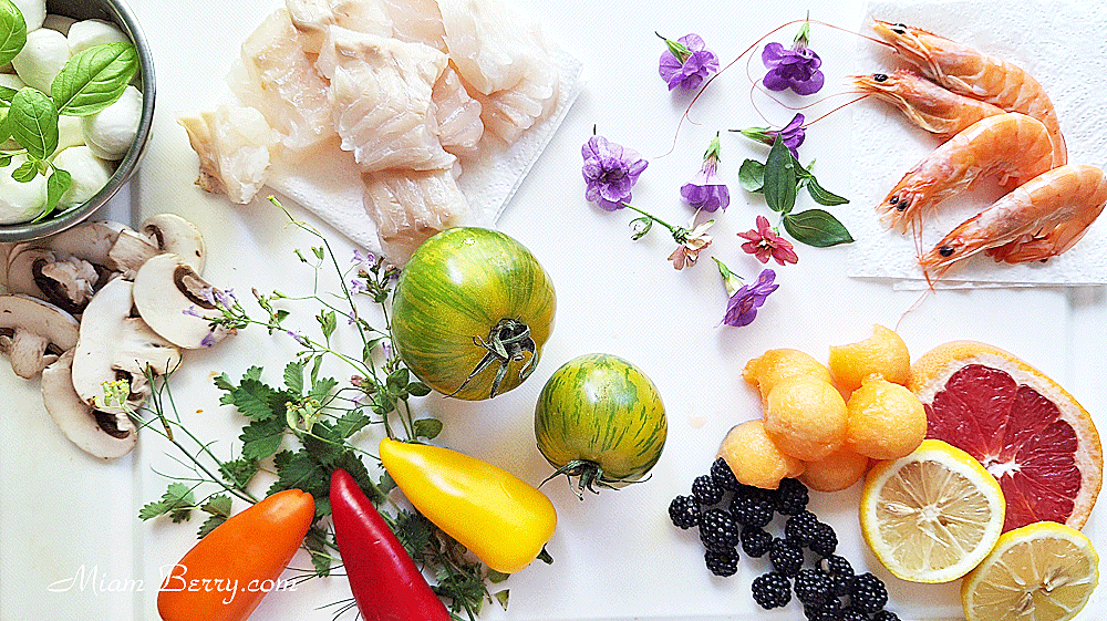 Pressez 3 autres citrons. Dans un saladier, mélangez leur jus avec 3 c. à s. d’huile d’olive, 1 pincée de piment d’Espelette et les herbes aromatiques / en toutes petites quantités. Introduisez les crevettes, les dés de poissons et remuez jusqu’à ce que l’ensemble soit bien enrobé du mélange.
