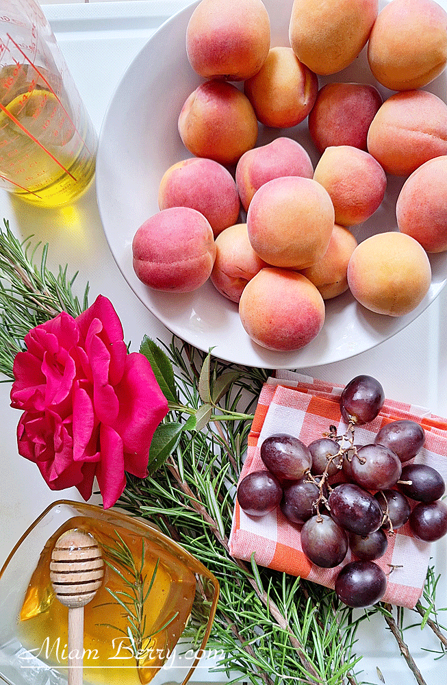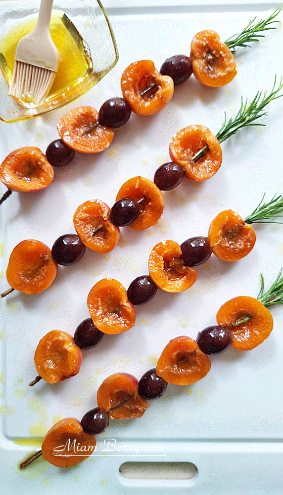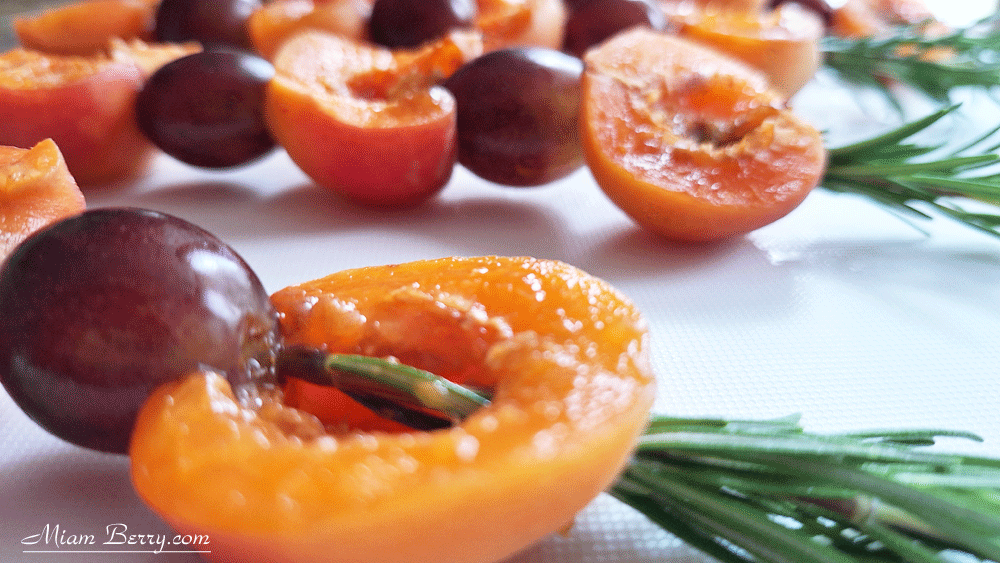 3. Coupez en deux les 8 abricots. Ôtez les noyaux. Piquez les moitiés d’abricots sur les branches de romarin, en intercalant ceux-ci d’un grain de raisin.