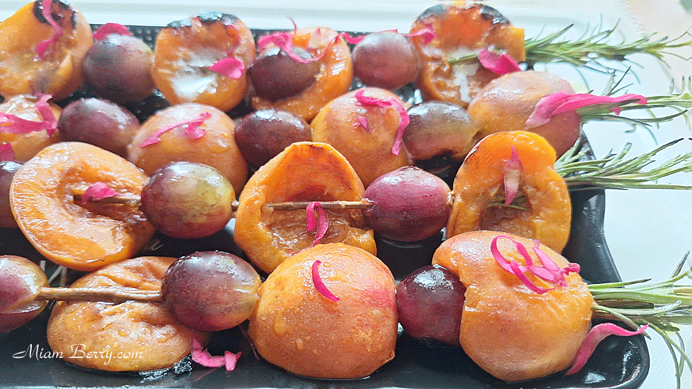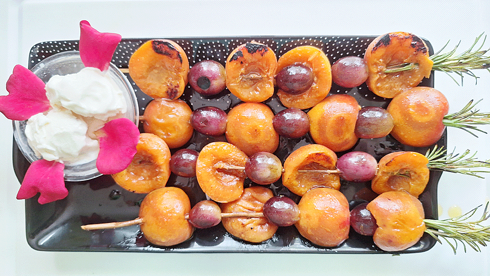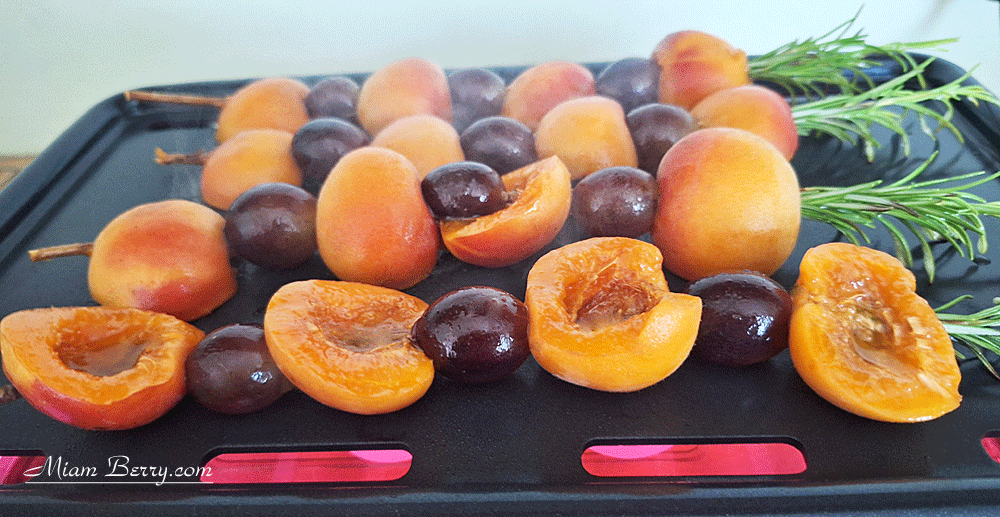 La météo n’étant pas vraiment au beau fixe ce jour-là, j’ai utilisée la plancha d’appoint, pour cuire à l’intérieur. Un dessert aussi facile que rapide à préparer : des brochettes fruitées, cuites en 3 mn sur chaque face. Aimez-vous les abricots cuisinés de cette façon ?