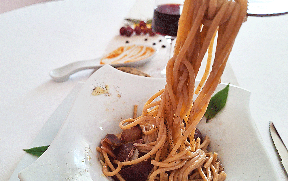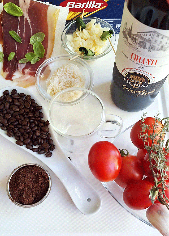 Le grand allier de ce déjeuner est sans conteste l’incontournable boisson chérie qu’est le café, celui que l’on aime préparer chez soi, celui synonyme de plaisir, de convivialité partagée entre amis. Une sauce crémée via un expresso nappant à la cuillère des spaghettis agrémentés de jambon de Parme, de raisin d’Italie poêlé. Servi à part, une sauce tomate maison, avec les tomates « Roma » du potager, ramassées 10 mn avant de préparer la sauce avec huile d’olive, ail et thym.