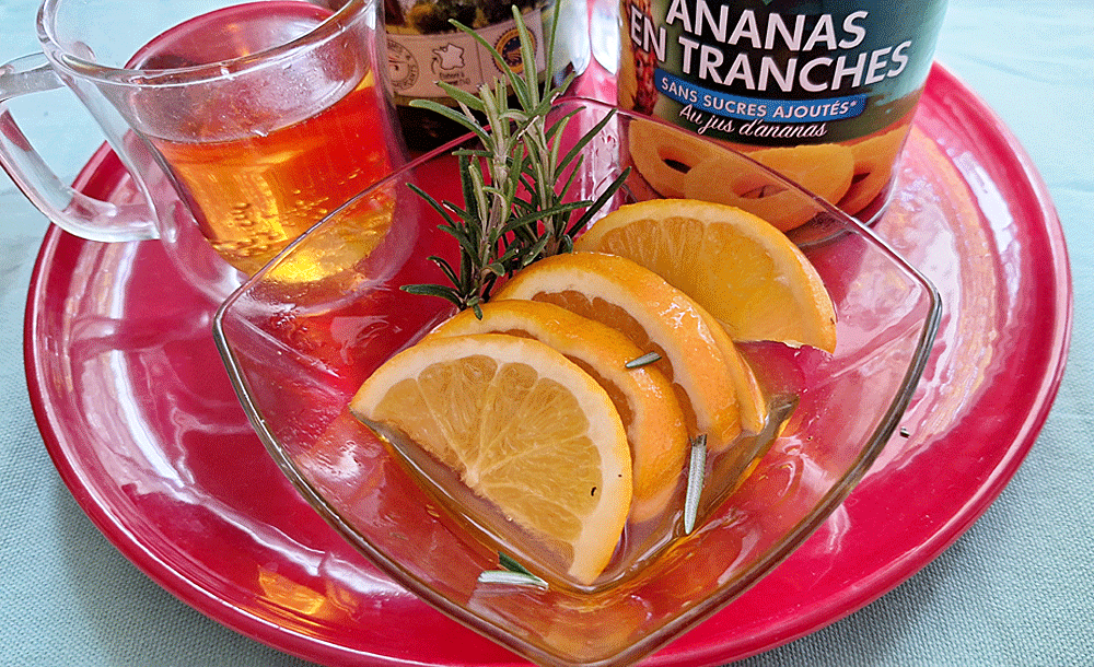 Au jardin, la sauge ananas étant en fleurs, j’y ai prélevé deux brins (feuilles-fleurs) ajoutés pour ajouter à la préparation.