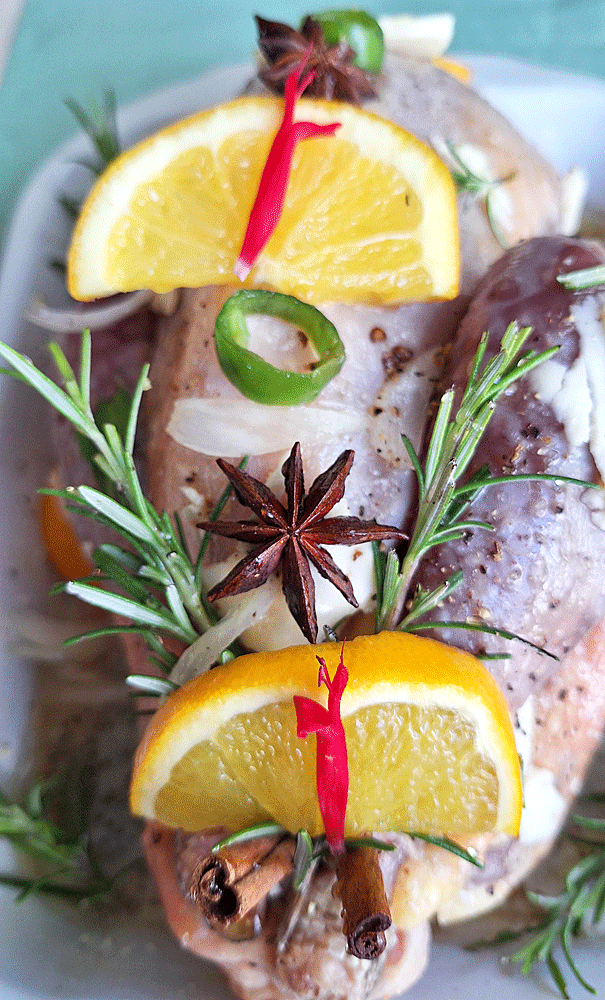 Le dessous de la pintade a été bien arrosé avec les sucs de cuisson mélangés entre eux pour une délicieuse sauce filtrée ensuite au-dessus d’une petite passoire. Les arômes entre le romarin, le citron, les feuilles de sauge, la cannelle et l’anis étoilé ont vraiment sublimé la volaille.