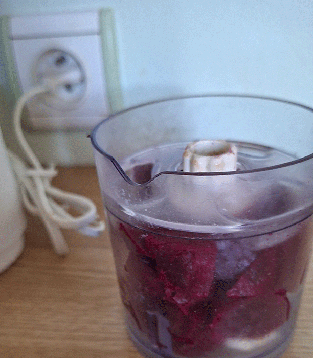 Éplucher la betterave cuite. La couper en morceaux et la mixer. Mettre en attente dans un bol.