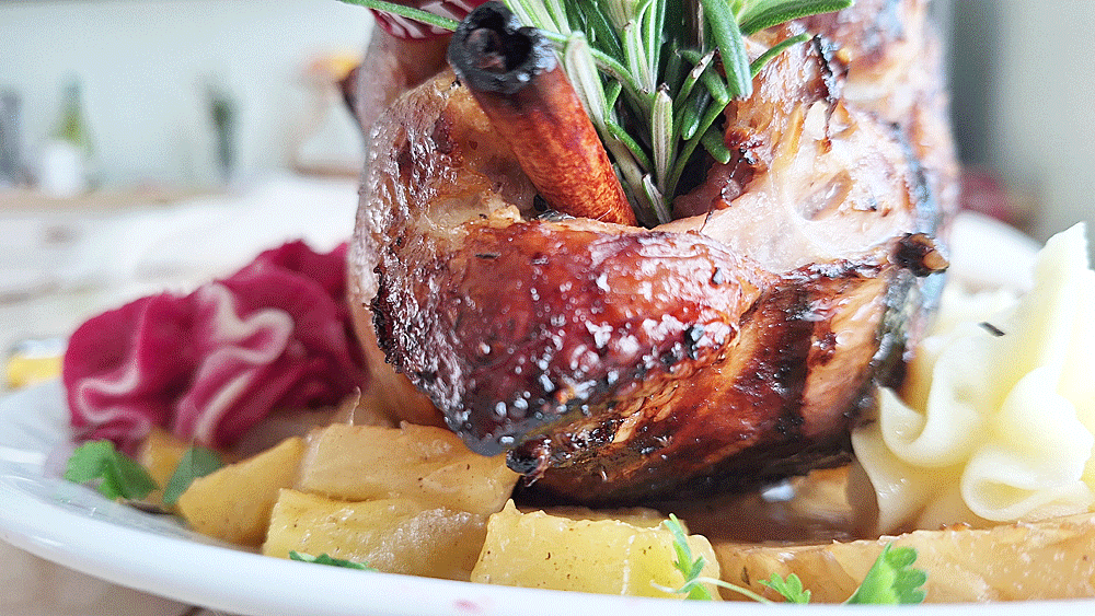 La noble saveur des volailles s’invite à nos tables de fêtes. Aujourd’hui, la recette réalisée à ce propos, est une pintade, j’aime cuisiner cette volaille-gibier à chair brune. Une pintade à rôtie, accompagnée d’ananas, puis à base d’une purée de pommes de terre que j’ai ensuite divisée pour faire, avec une partie basique et l’autre moitié en ajoutant de la betterave bien mixée, pour la touche décorative comme ceci.