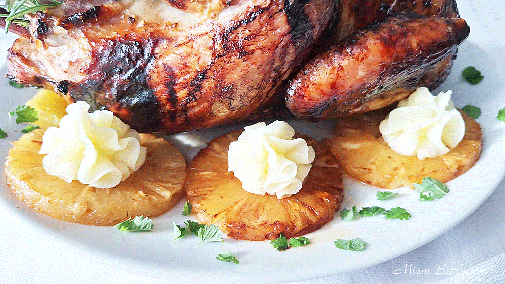 J’ai recomposé chacune des purées dans 2 casseroles, avec chacune 3 c. à s. de lait chaud et en veillant à ne pas diluer trop liquide, pour passer celles-ci dans une poche à douille. J’ai dressé d’abord le plat en mettant d’un côté les rondelles d’ananas et de l’autre les morceaux. Puis les rosaces de purée dessus – la viande légèrement arrosée d’un filet de sauce filtrée et le reste de la sauce servi en saucière.