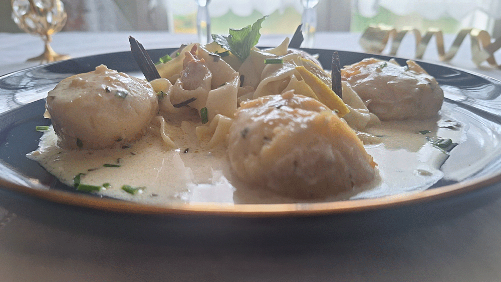 Voici une exquise variation de pâtes, laquelle se prête aussi à des assiettes festives qui sont irrésistibles. Partagez avec vos amis ces pâtes accompagnées de noix de St. Jacques crémées avec du beurre demi-sel, auquel j’ai simplement ajouté des fines herbes ciselées menues. Une sauce à base de crème fraîche, de vin blanc sec, marinée au fumet de poisson, au vinaigre de vin blanc et à la ciboulette.