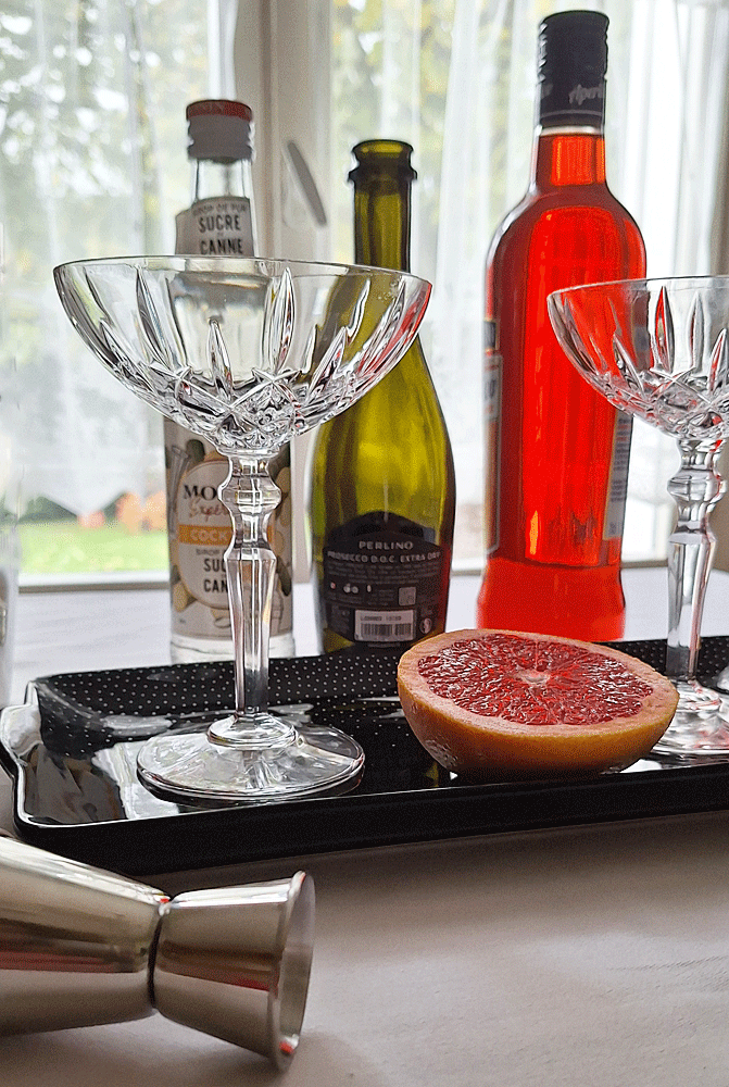 2. Dans un shaker rempli de glace, verser le jus du pomelo, le sirop et l’Apérol. Faites faire un petit tour de danse habituel à votre shaker, puis verser le tout dans de jolies coupes à champagne. Ajouter à la préparation le Prosecco. Et voici qui est prêt.