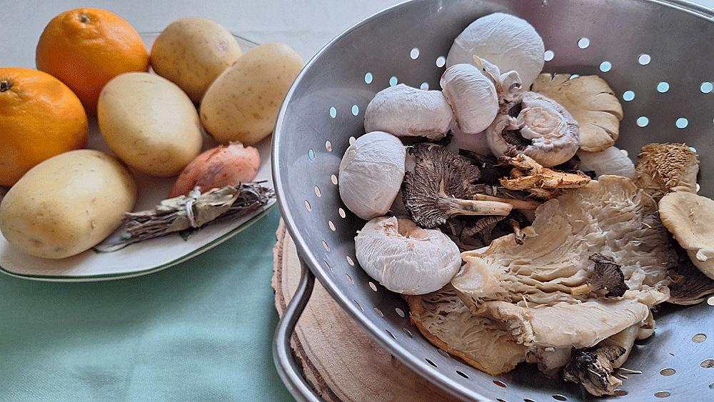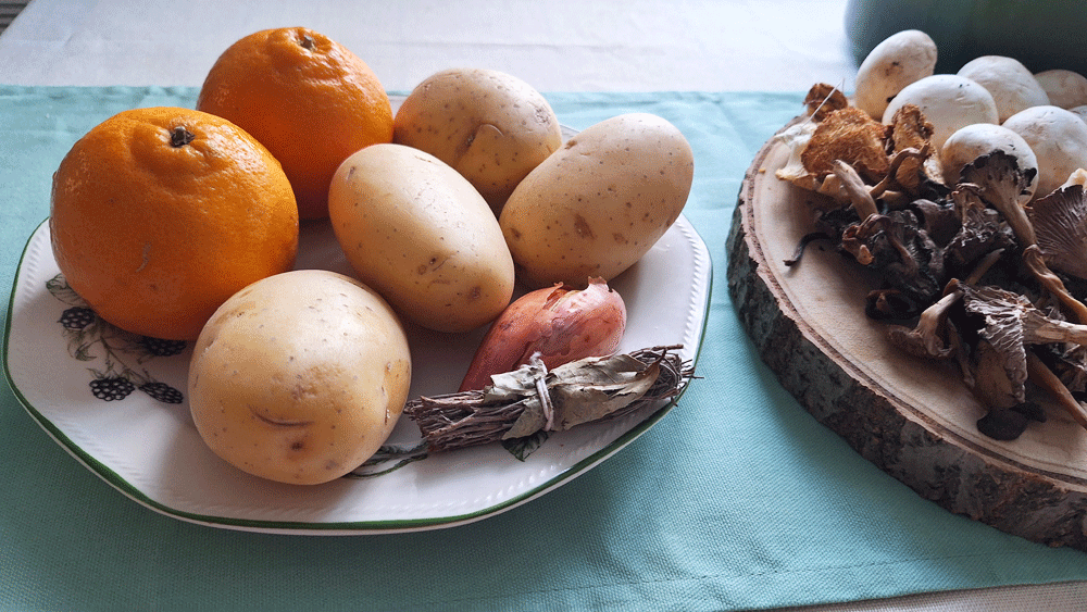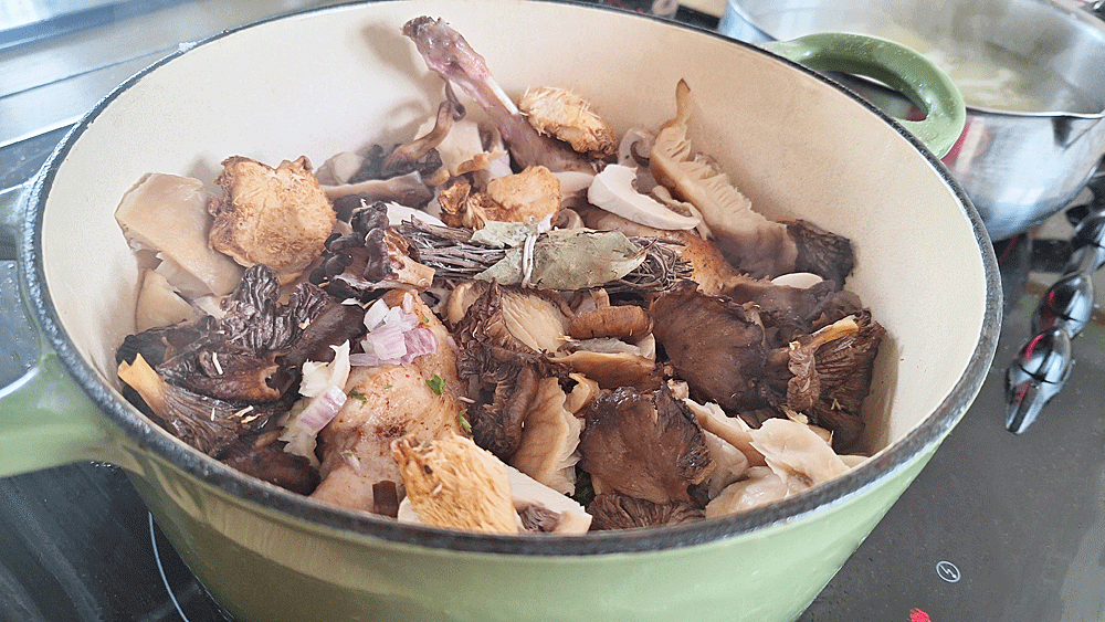 Aujourd’hui, je vous propose un plat mijoté au vin blanc. Pour ma recette, je sélectionne des champignons tels que le pied de mouton, le champignon blanc (un peu plus gros que le champignon de Paris), le pleurote, la chanterelle… Ce que vous trouverez sur votre marché sera forcément à votre goût.