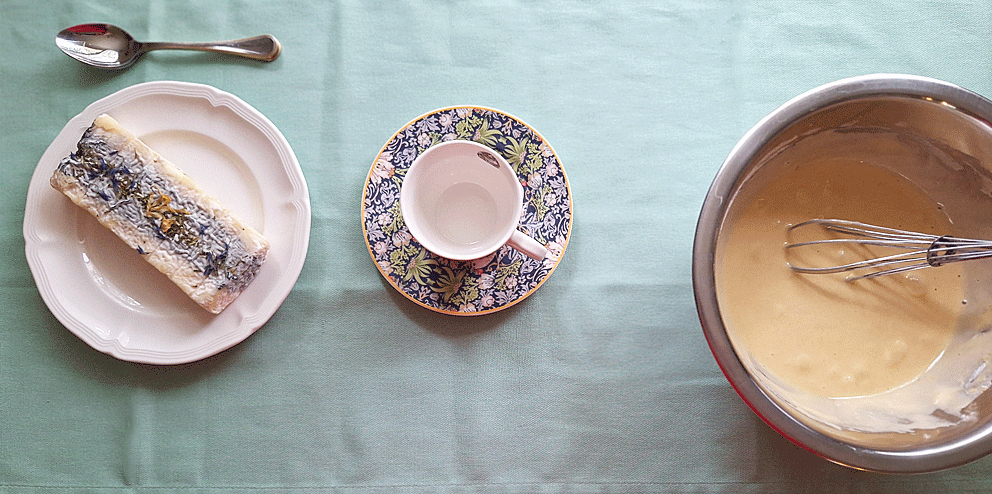 Pour bien incarner mon sujet au cœur de la cuisine – car parfois il suffit de faire deux pas vers la cuisine pour voyager – j’ai souhaité assortir ce duo de service à café en porcelaine délicate de deux expressos de 110 ml et de deux cupcakes maison de crèmes fouettée – non loin d’une brique de fromage aux fleurs printanières.