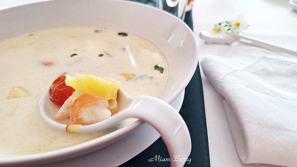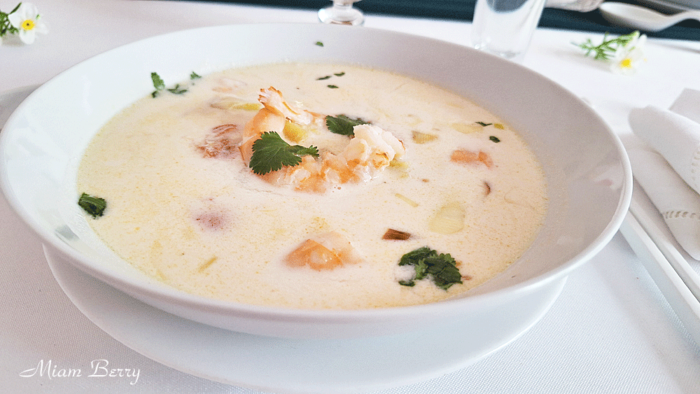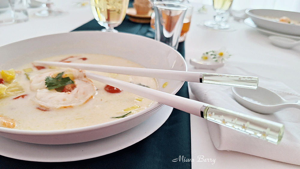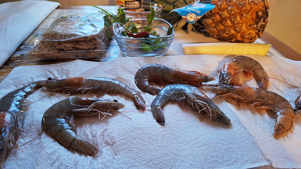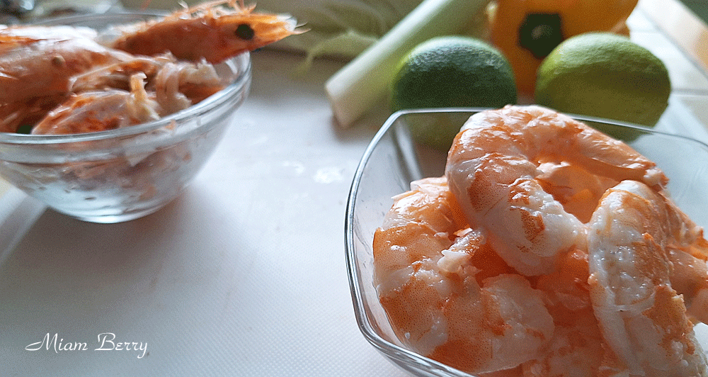 Cette soupe thaï que je réalisais pour la proposer comme entrée, est absolument délicieuse ! Composée de crevettes, de poivron, se réalise très facilement, malgré qu’elle demande un peu de préparation : d’abord le court-bouillon avec le fumet de poisson pour cuire les crevettes qui, à la base, sont crues ; puis, le liant de la soupe à réaliser avec ananas, épices, blancs de poireau et quelques ingrédients asiatiques.