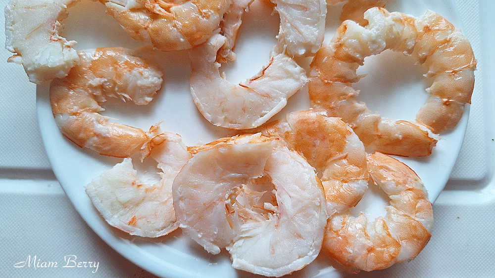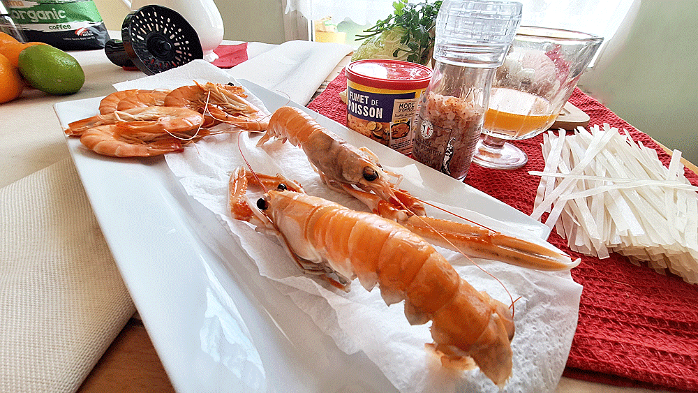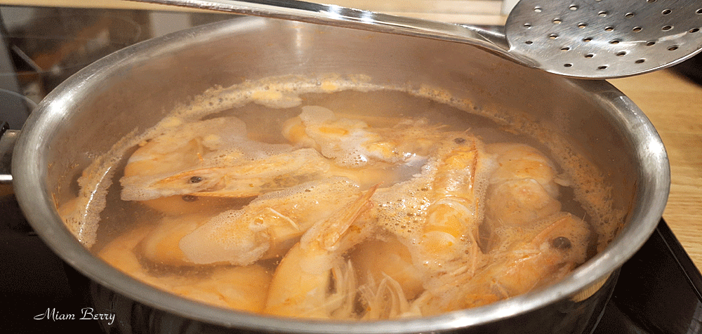 Ci-dessus, les crevettes fraîches et crues proviennent de l’Équateur. Avant de préparer leur bouillon de carapaces décortiquées, je les nettoie dans de l’eau additionnée de vinaigre blanc – par précaution d’hygiène –, puis je les plonge dans une casserole contenant 1 l d’eau et seulement après dans l’eau en ébullition : 3 mn de cuisson à partir de l’ébullition, puis baisser le feu pour terminer de les cuire, 1/2 mn de plus.