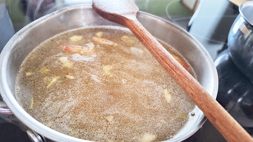 Dans une casserole, verser un peu d’huile et faire revenir sur feu moyen les carapaces et les cuticules des crevettes préalablement décortiquées. Saler et poivrer à votre convenance, puis ajouter à la préparation le gingembre taillé en fines rondelles, l’ail et quelques zestes de lime.