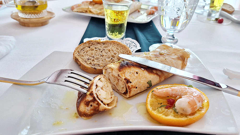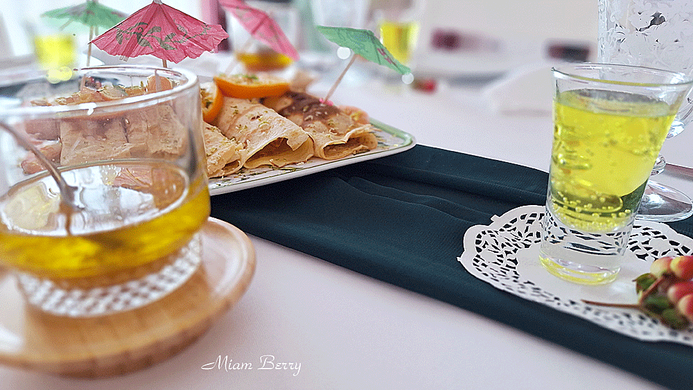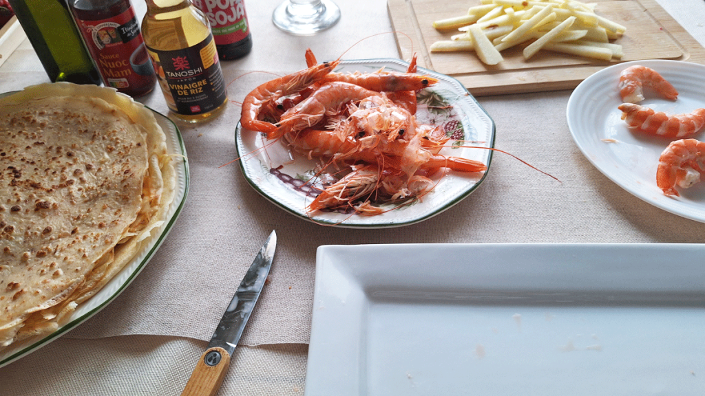 Des crêpes au lait de coco, fourrées de bâtonnets de pomme, de crevettes fraîches Madagascar, de cacahuètes grillées-concassées et non salées – le tout accompagné de 2 sauces maison : sauce Thaïe et sauce Viet … ça vous dit ? … En garniture finale : rondelles de Mineolas saupoudrées de coriandre.