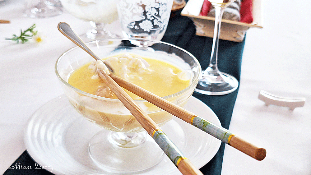 Léger, aéré, tout en restant gourmand, je confectionnais – là aussi, sans être une véritable recette – davantage par inspiration : une base de crème anglaise maison (la plus récente que je fis) à laquelle y ajouter un peu de jus de litchi (boîte) et, bien sûr, le fruit lui-même. Les baguettes, justement, pour saisir le fruit et honorer la tradition, jusqu’à la terminaison du repas. Une cuillère pour la crème anglaise.