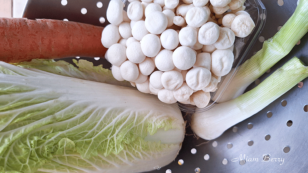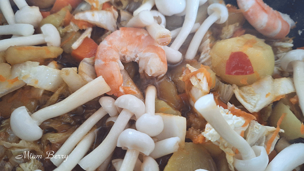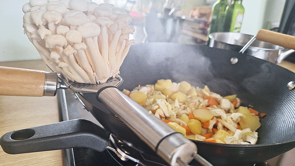 En ce qui concerne les champignons intégrés au mijoté, il se trouve que c’est une variété de champignon provenant du Japon, qui pousse en hiver sur des troncs d’arbres. Ils étaient proposés comme une offre spéciale pour le Nouvel An Chinois – À cuire avant de les consommer.