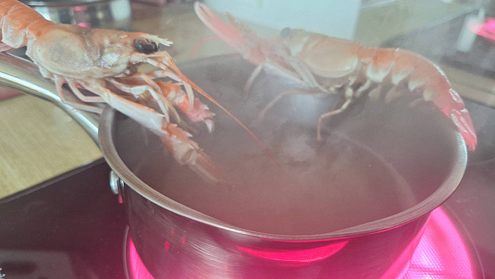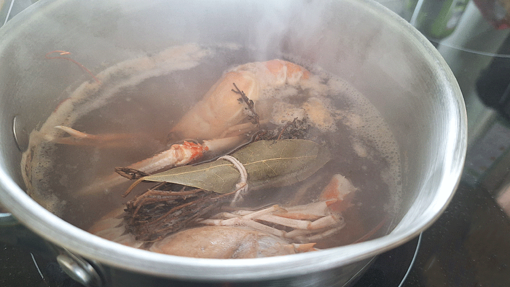 Très simple et rapide : mettez de l’eau dans une casserole, puis placez-la sur feu moyenne. Quand l’eau arrive à ébullition, plongez les langoustines et comptez pour 3 minutes de cuisson. Ajoutez un bouquet garni à ce court-bouillon, puis incorporez une légère touche de fumet de poisson dilué dans 1/4 d’eau. Ensuite, assaisonnez avec sel et poivre.