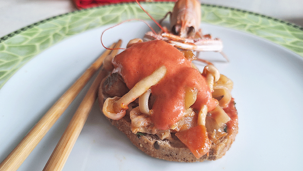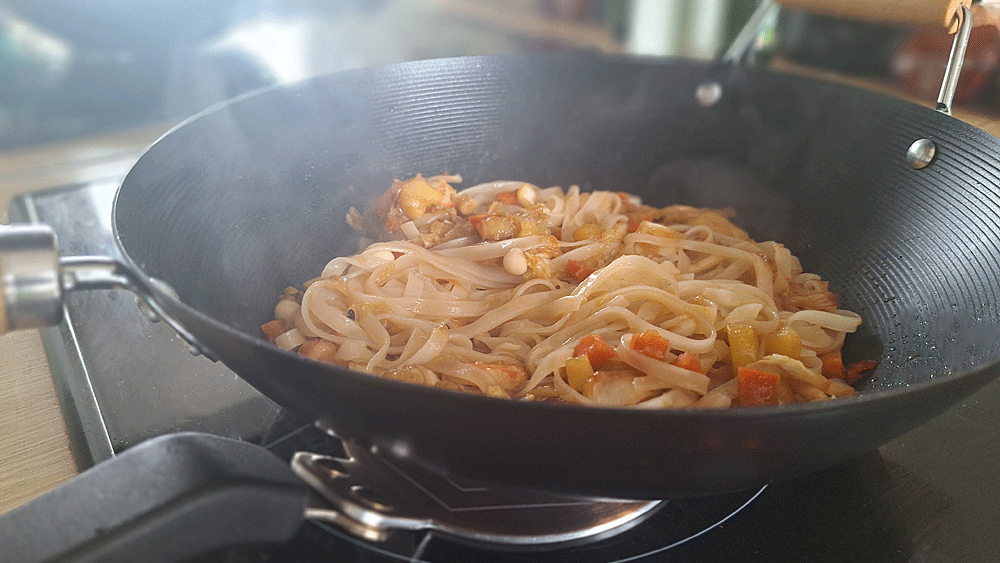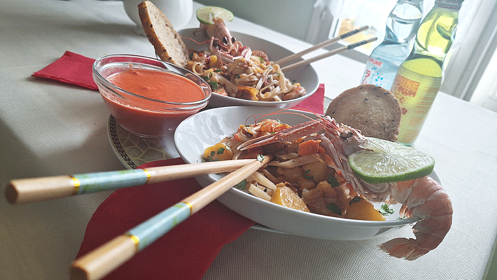 C’est un plat que je réalisais à l’envie, sans recette particulière, mais en dosant toutefois bien les divers ingrédients. L’idée était de réaliser d’abord une sauce tomate maison que j’ajouterais aux nouilles de riz cuites au préalable – puis au wok – avec chou chinois, carotte, oignons verts, crevettes de Madagascar cuites.
