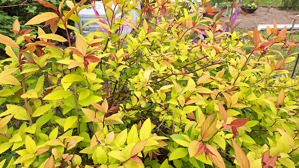 Elle fleurit rose en été, et porte des feuilles d’un jaune éclatant.