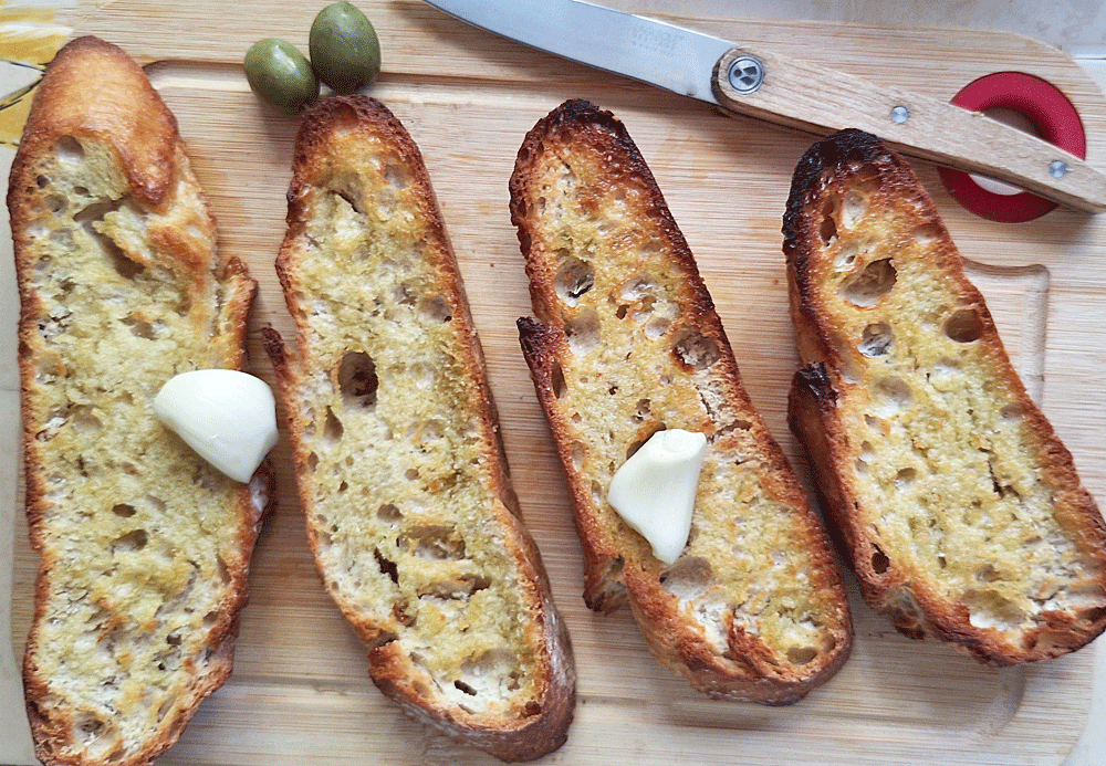 2. Une fois le pain encore chaud, passez dessus une gousse d’ail, bien imprégner.