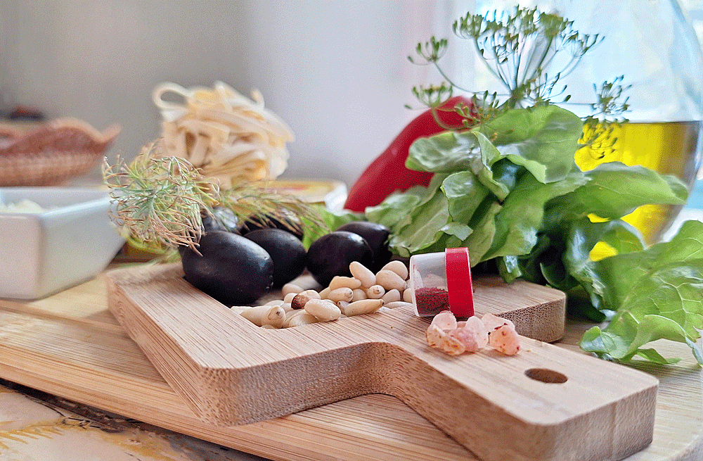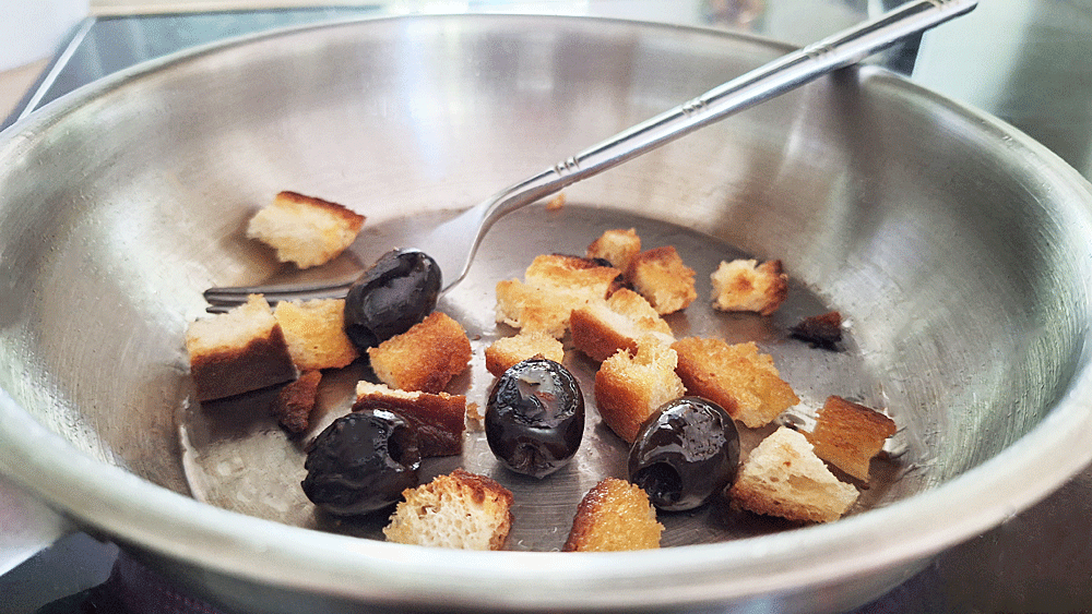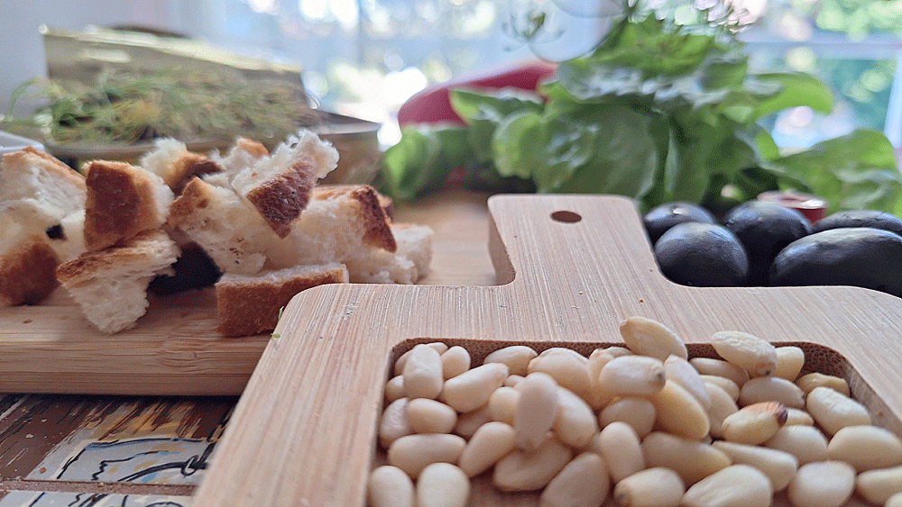 Délicieuse idée Muriel ! Et que des choses que j’aime en plus: olives noires, pignons de pin !