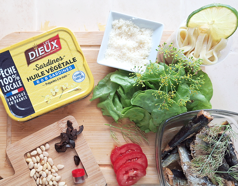 J’aime beaucoup les sardines à l’huile avec des olives noires, donc c’est une boîte repas faite pour moi.