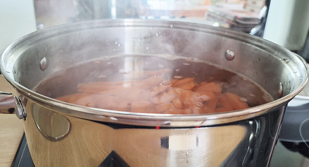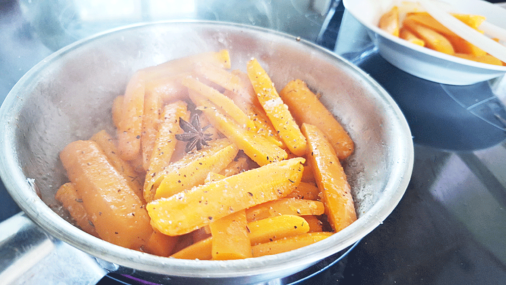 2. Faire bouillir une casserole ou faitout d’eau salée. Plonger les carottes et laisser cuire pendant environ 10 mn, jusqu’à ce qu’elles soient tendres. Puis le égoutter.