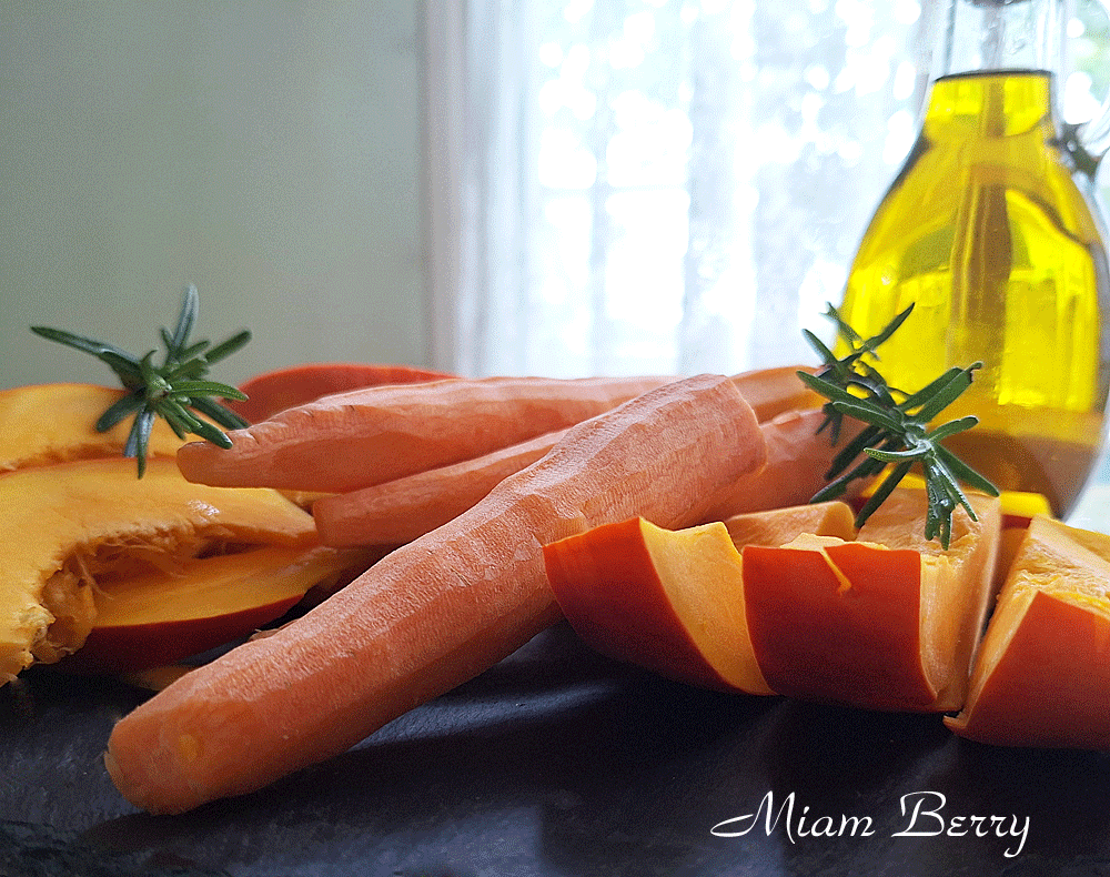 Tapisser une plaque de cuisson de papier sulfurisé. Disposer dessus des morceaux de potiron et de carotte, avec 1 c. à s. d’huile d’olive, sel et poivre. Étaler sur la plaque de cuisson préparée.