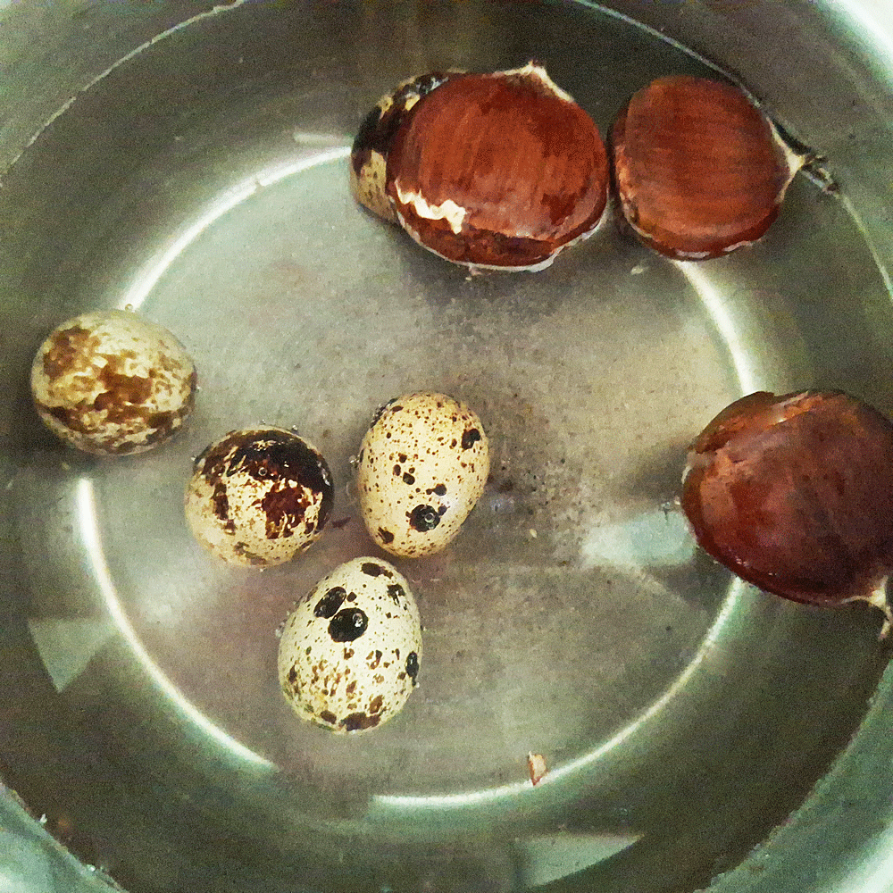 Facultatif : Quelques œufs de caille que je cuis avec les châtaignes seront ajoutés au dressage de l’assiette.