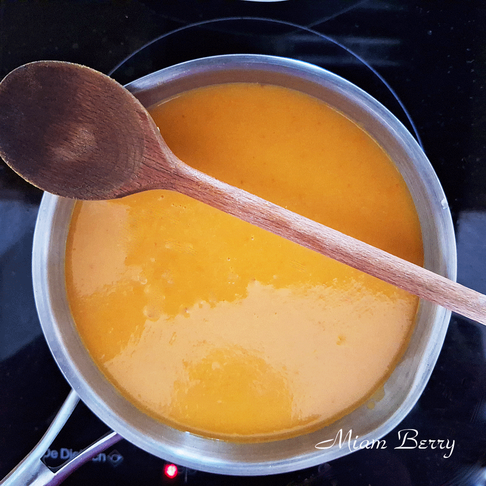 Après quoi, le potiron est autrement bien plus facile à domestiquer : notamment facile à tailler les tranches et pas nécessairement utile d’enlever la peau, qui va disparaître en mixant la soupe. Quel gain de temps !