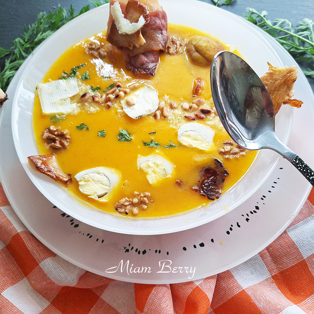 Paroles de Berrichonne… Évoquant des saveurs authentiques de la campagne, voici une soupe préparée avec des légumes frais de saison, un petit fromage régional, le jambon « le Berrichon », une poignée d’œufs de caille, des girolles, des noix et des châtaignes, pignons de pin. Les épices intervenantes sont la muscade et le curcuma. En petite touche finale, un brin de persil ciselé au moment et directement sur la soupe.