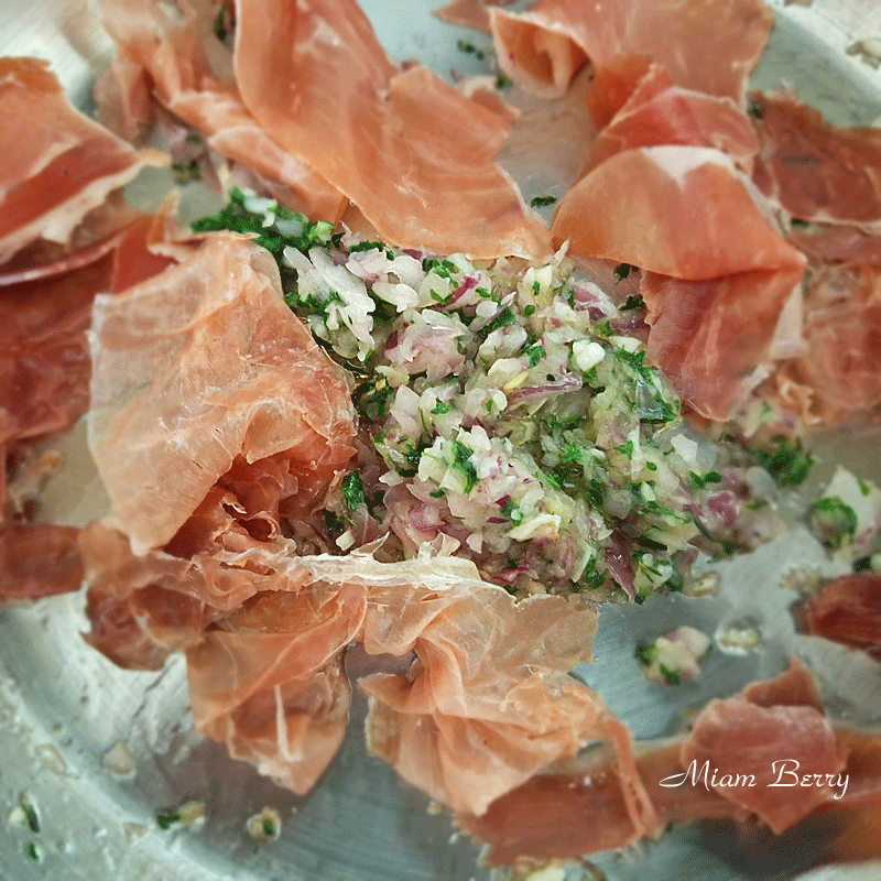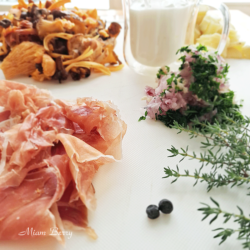 • 2 tranches de jambon sec à déchiqueter en chiffonnade : type speck, typique du Tyrol et sous nos latitudes, un bon jambon sec sera de mise.