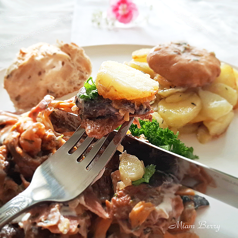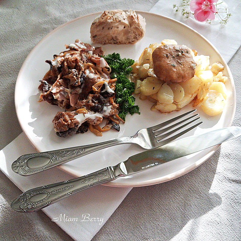 Poêlée de pommes de terre coupées en rondelles avec thym frais, légumes, omelette, crêpe seront parfaites avec cette préparation forestière, d’où à été entendu chanter le coq de bruyère.