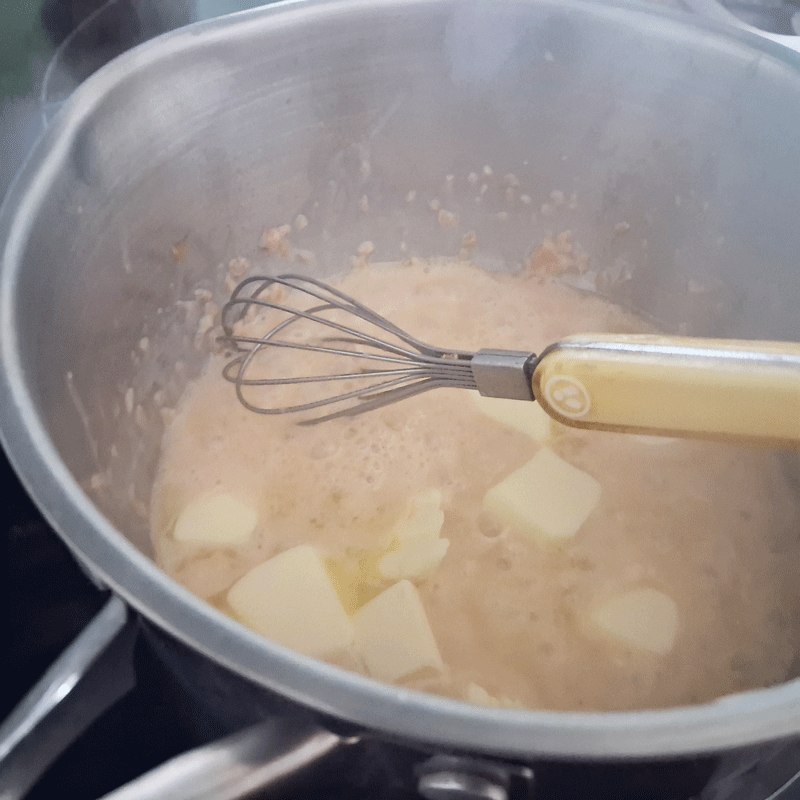 2. Ajoutez la crème fraîche, puis montez la sauce en incorporant progressivement les morceaux de beurre froid, tout en fouettant.
