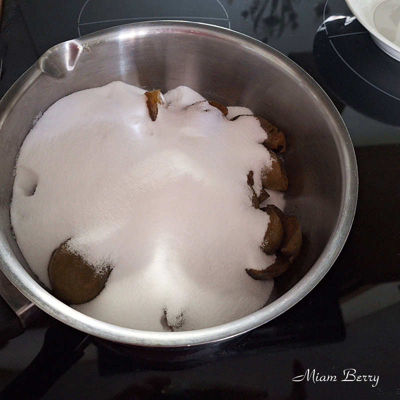 1. Lavez les prunes, coupez-les en deux et retirez les noyaux. Dans un grand récipient, mélangez les prunes avec le sucre et le jus de citron. Laissez macérer ainsi pendant 1 à 2 heures, pour que les fruits libèrent leur jus.