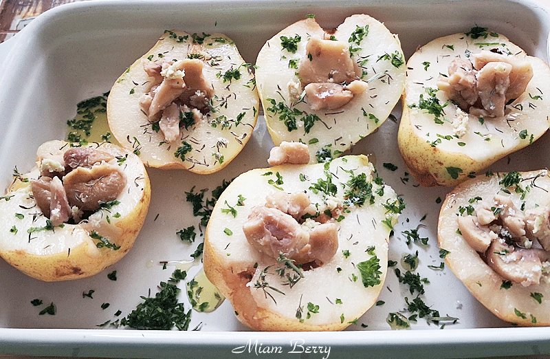 3. Préparation de la farce : Dans un bol, émiettez les châtaignes cuites et écorcées. Disposez dans chaque cœur de poire puis recouvrir de fromage bleu. Badigeonnez d’huile d’olive et de miel.