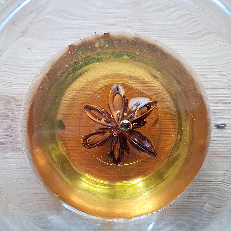 • 1 anis étoilée laissée doucement infusée dans le miel, venant napper la préparation juste avant de passer au four