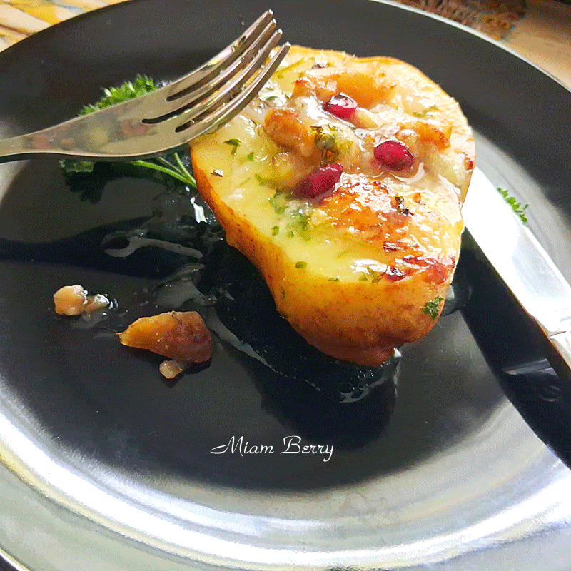 Les poires William, fondantes et juteuses, rôties avec un émietté de châtaignes cuites préalablement, puis recouvertes de bleu d’Auvergne, d’herbes aromatiques (thym et persil). Le tout arrosé de jus de grenade frais, puis, juste avant le service, quelques grains de grenade déposés de ci, de là, finissent la préparation d’un plat absolument divin.