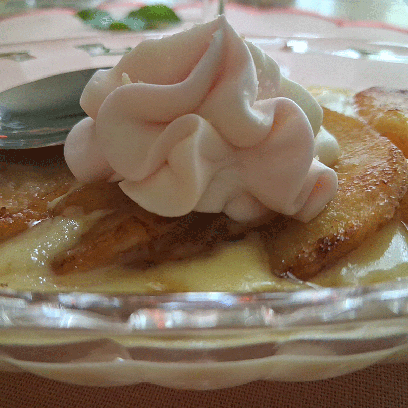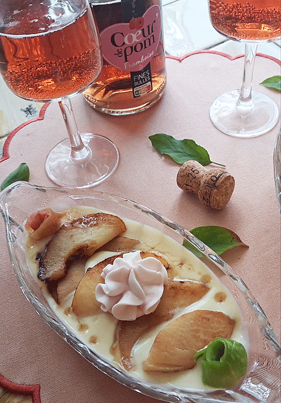 Reinettes – récolte de cette année – et quelques feuilles du moment, j’ai accompagné ce délice d’une crème anglaise onctueuse et veloutée. Faisant de ce dessert un duo de saveurs prompt à ravir les papilles !